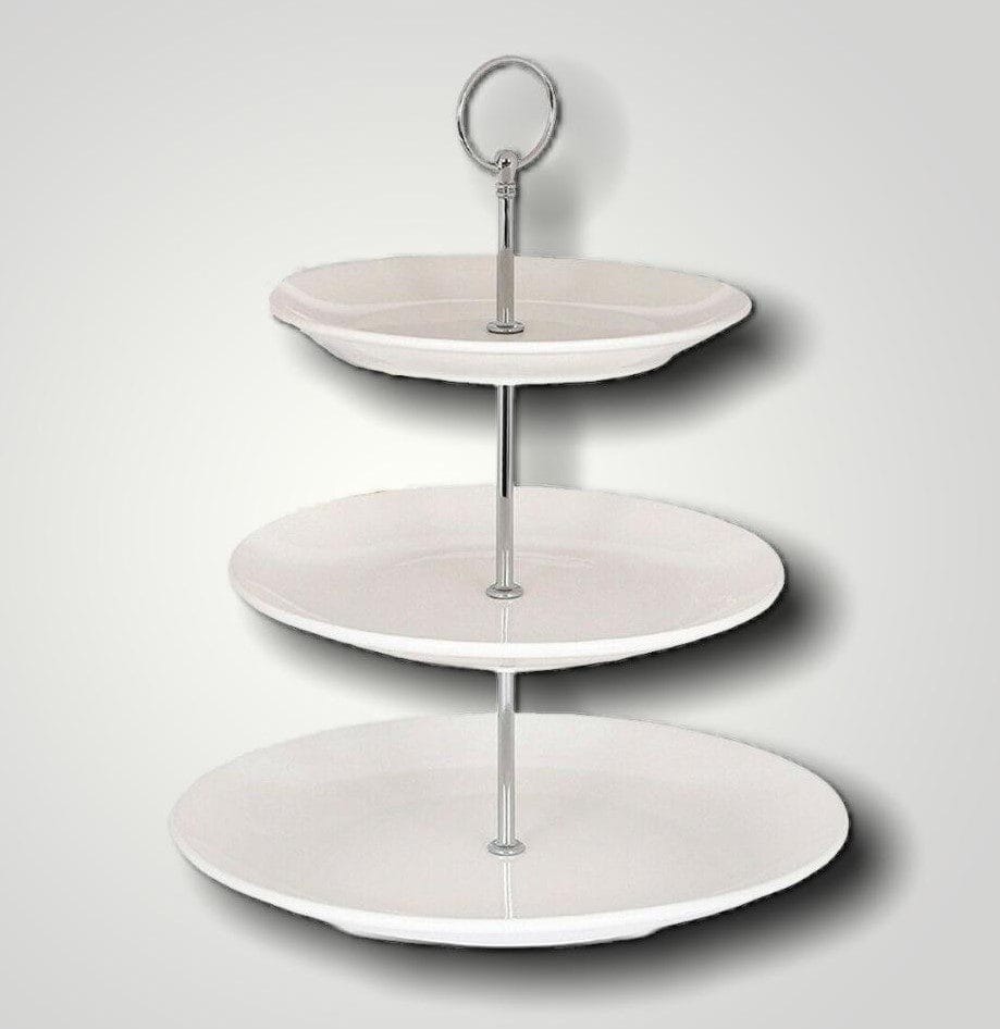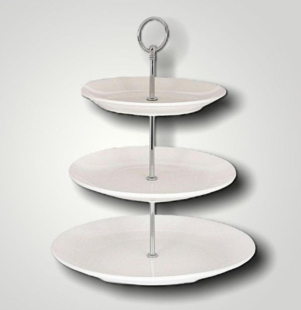 Made from glossy white porcelain, this traditional three tier cake stand features a silver stem and handle.