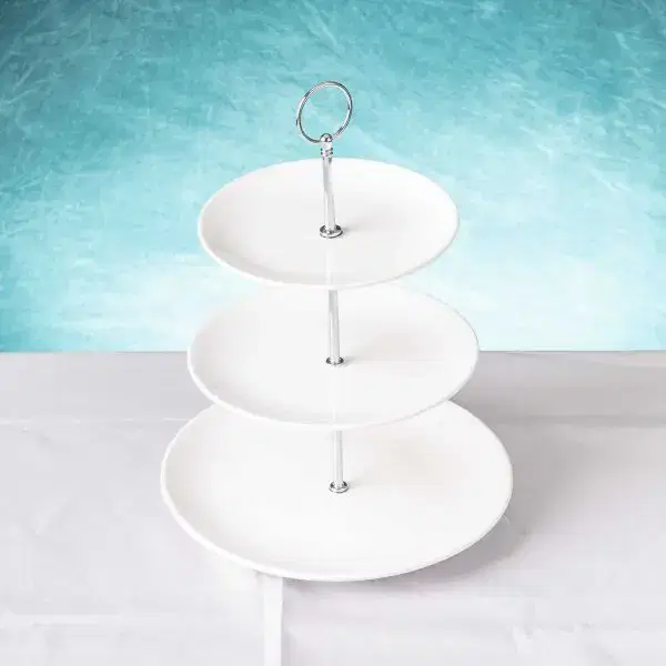Made from glossy white porcelain, this traditional three tier cake stand features a silver stem and handle.